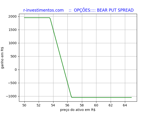 - Se o ativo objeto-estiver abaixo da PUT vendida. Logo, o resultado será a PUT comprada menos a PUT vendida menos o prêmio líquido pago, neste caso, será o máximo ganho da operação.