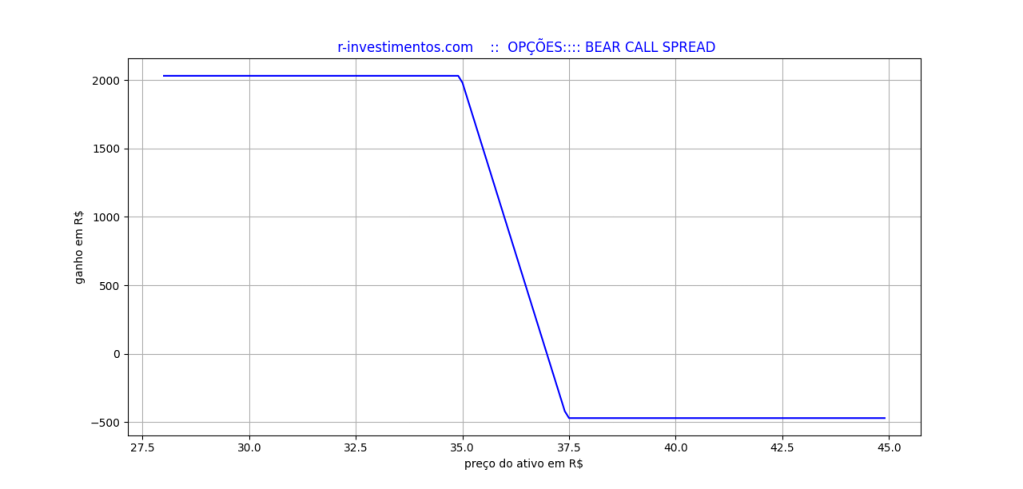A estrutura aqui apresentada é a “Trava de Baixa com Call” ou “Bear Call Spread”, essa estrutura é usada quando o investidor percebe, a partir da sua análise, que o ativo-objeto tem uma tendência de baixa e, se confirmada, haverá o ganho máximo da estrutura, que pode ser previamente dimensionado. Por outro lado, se a análise estiver errada e o ativo-objeto performar uma alta, da mesma forma, o investidor poderá antecipadamente calcular a sua máxima perda.