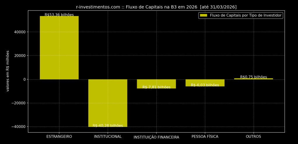 No primeiro trimestre de 2026, a entrada de capital estrangeiro na B3 manteve um ritmo forte, registrando um fluxo líquido de R$53,36 bilhões, sendo em janeiro/2026 R$26,31; fevereiro/2026 R$15,40 bilhões e março/2026 R$11,65 bilhões.